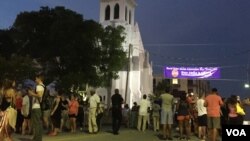 Десятки родных погибших, другие жители и гости города пришли к церкви в центре Чарльстона, чтобы почтить память жертв и возложить цветы к импровизированному мемориалу с венками и лентами, на которых написаны имена погибших.