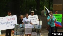 В четверг, 12 июня, в то время как в российском посольстве в Вашингтоне проходили официальные торжества по случаю Дня России, активисты собрались возле посольства, чтобы выразить свой протест против политики Кремля.