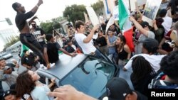 Несколько сотен демонстрантов и сторонников Трампа столкнулись до и после предвыборного мероприятия. Полицейские в спецснаряжении, сформировав заградительные линии, попытались удержать стороны от столкновения.
